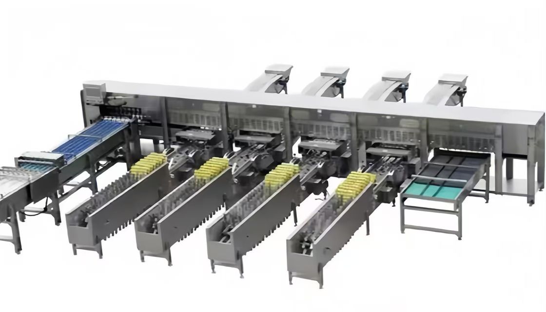 विभिन्न वजन के अंडे इलेक्ट्रॉनिक एग ग्रेडर की विभिन्न लेन पर गिरते हैं। वैकल्पिक रूप से कुछ अंडा संग्रह में प्रवेश करते हैं