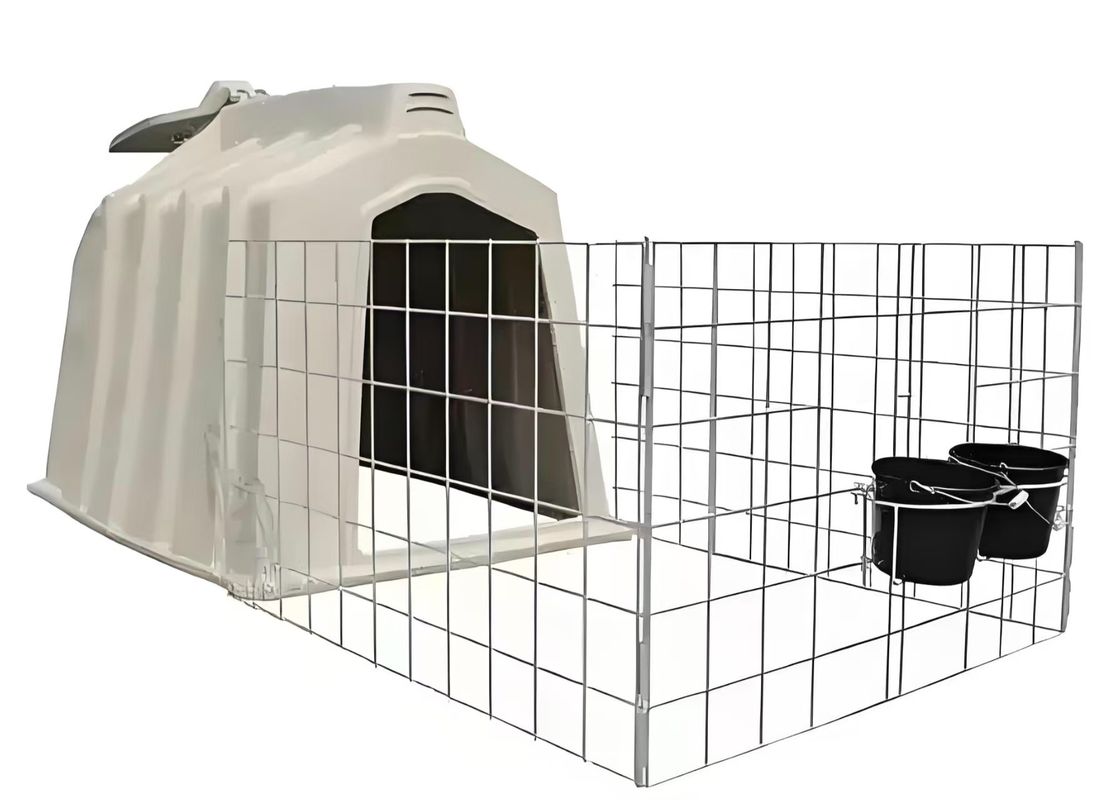 उच्च मानक गैल्वेनीzएड स्टील रॉड या पाइप और प्लास्टिक बाड़ को अनुकूलित किया जा सकता है. सामने की बाड़ में दो बाल्टी धारक हैं, जो प्लास्टिक या स्टेनलेस स्टील की बाल्टियों के लिए उपयुक्त हैं. बाड़, बाल्टियाँ, फीडर और हे रैक सभी अतिरिक्त घटक खरीद के लिए हैं.